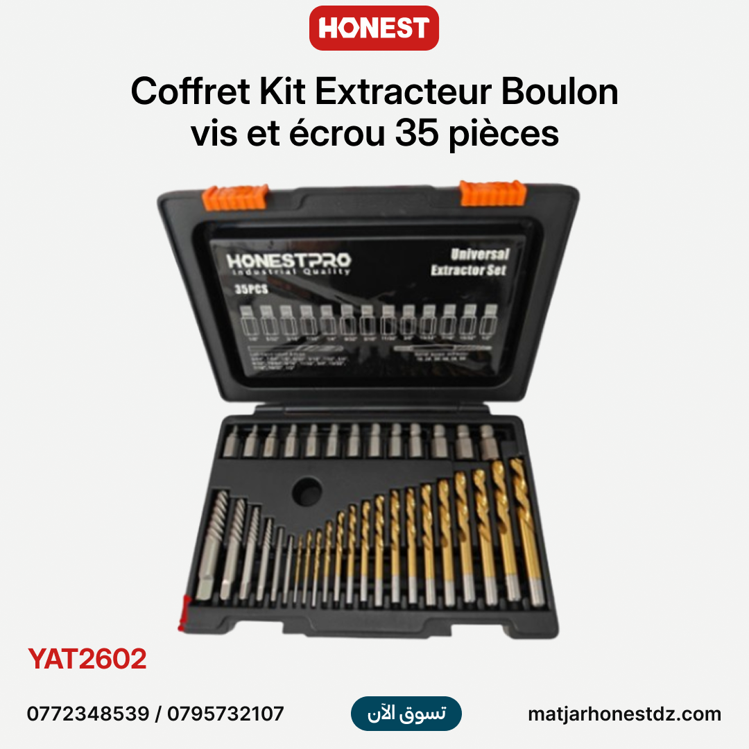 يُعد طقم المستخرجات YAT2602 من HONESTPRO الحل النهائي والمتكامل لمواجهة أصعب مشاكل الصيانة. صُممت هذه المجموعة المكونة من 35 قطعة خصيصاً لاستخراج البراغي، العزقات، والمسامير المكسورة، المتآكلة بفعل الصدأ، أو تلك التي تعرضت رؤوسها للتلف (Arrondis)، مما يتيح لك إنقاذ قطع الغيار والهياكل دون التسبب في أضرار إضافية.