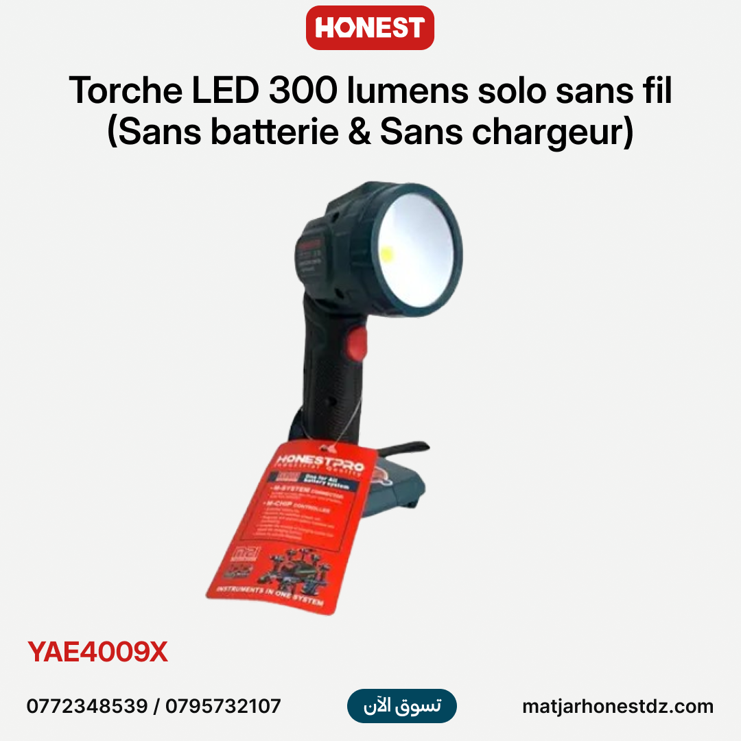 يوفر لك مصباح HONESTPRO YAE4009X إضاءة قوية ومركزة في مواقع العمل المظلمة أو أثناء حالات انقطاع الكهرباء. صُمم هذا المصباح ليكون رفيقاً مثالياً لمجموعة أدواتك اللاسلكية، حيث يتميز بخفة الوزن والمتانة العالية، مما يجعله أداة أساسية في ورشتك أو سيارتك.