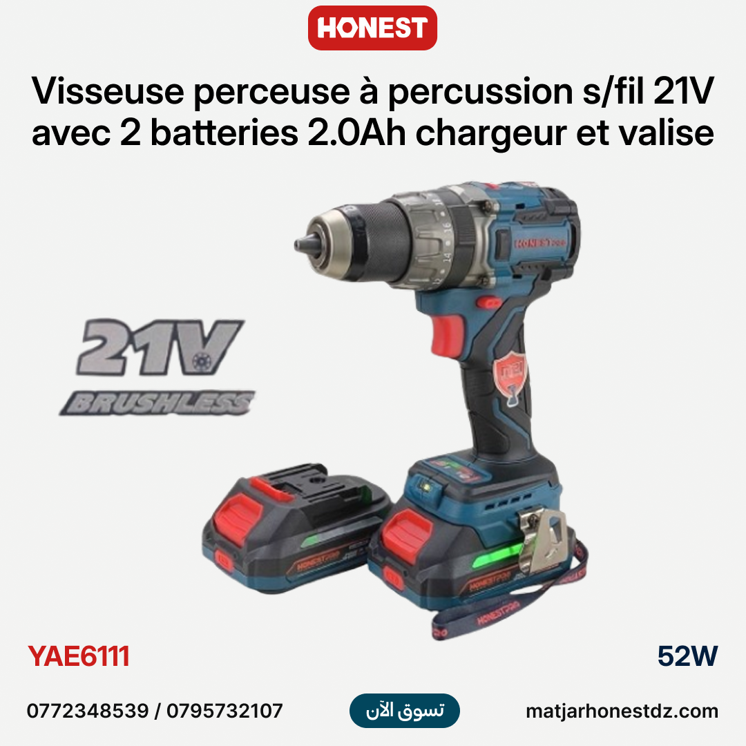 مثقاب ومفك براغي مطرقي لاسلكي (Visseuse) بمحرك Brushless وعزم 100 نيوتن متر من HONESTPRO | YAE6111